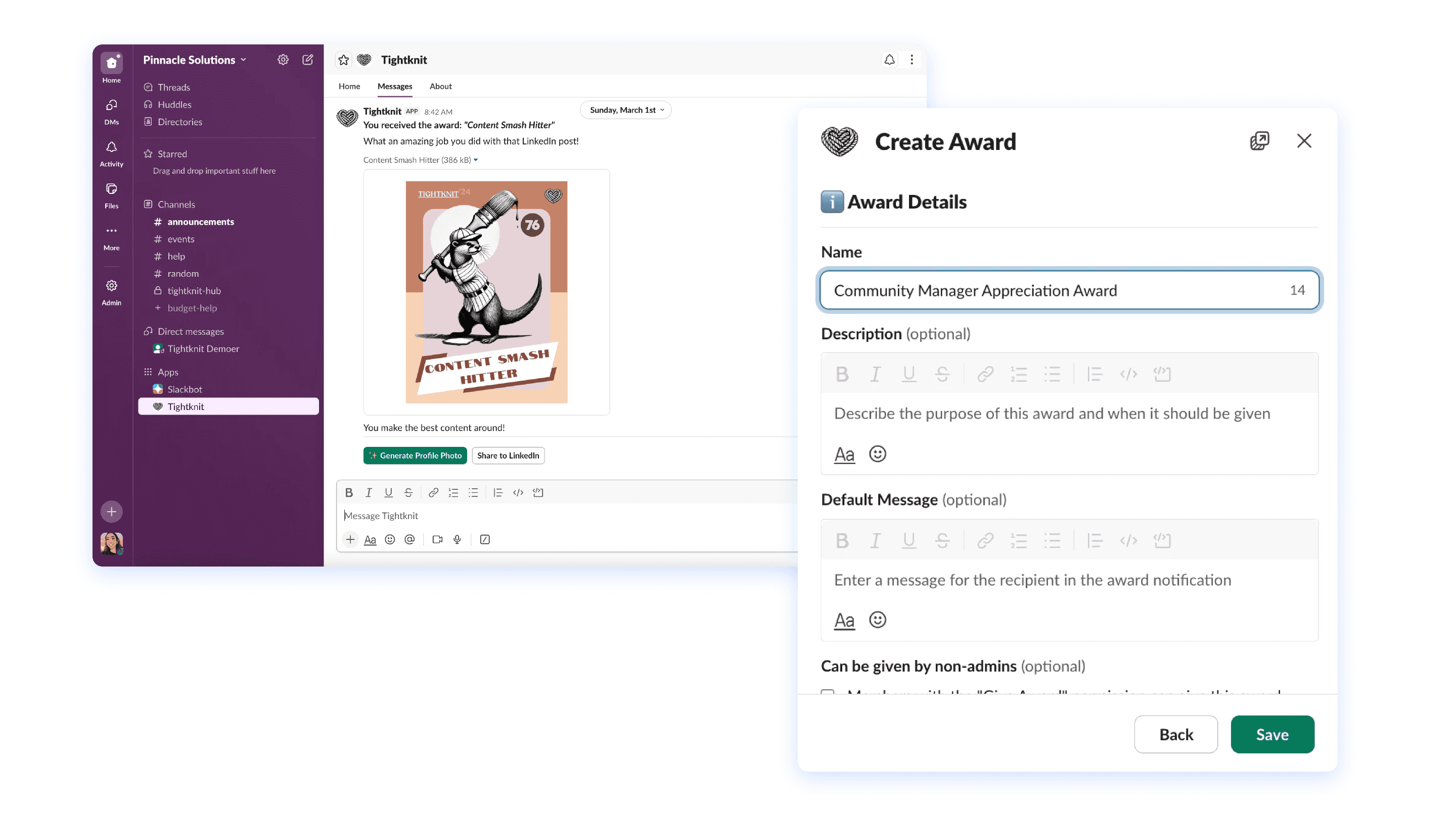 Certificate-style awards with labels, descriptions, LinkedIn prefill, and announcement options.