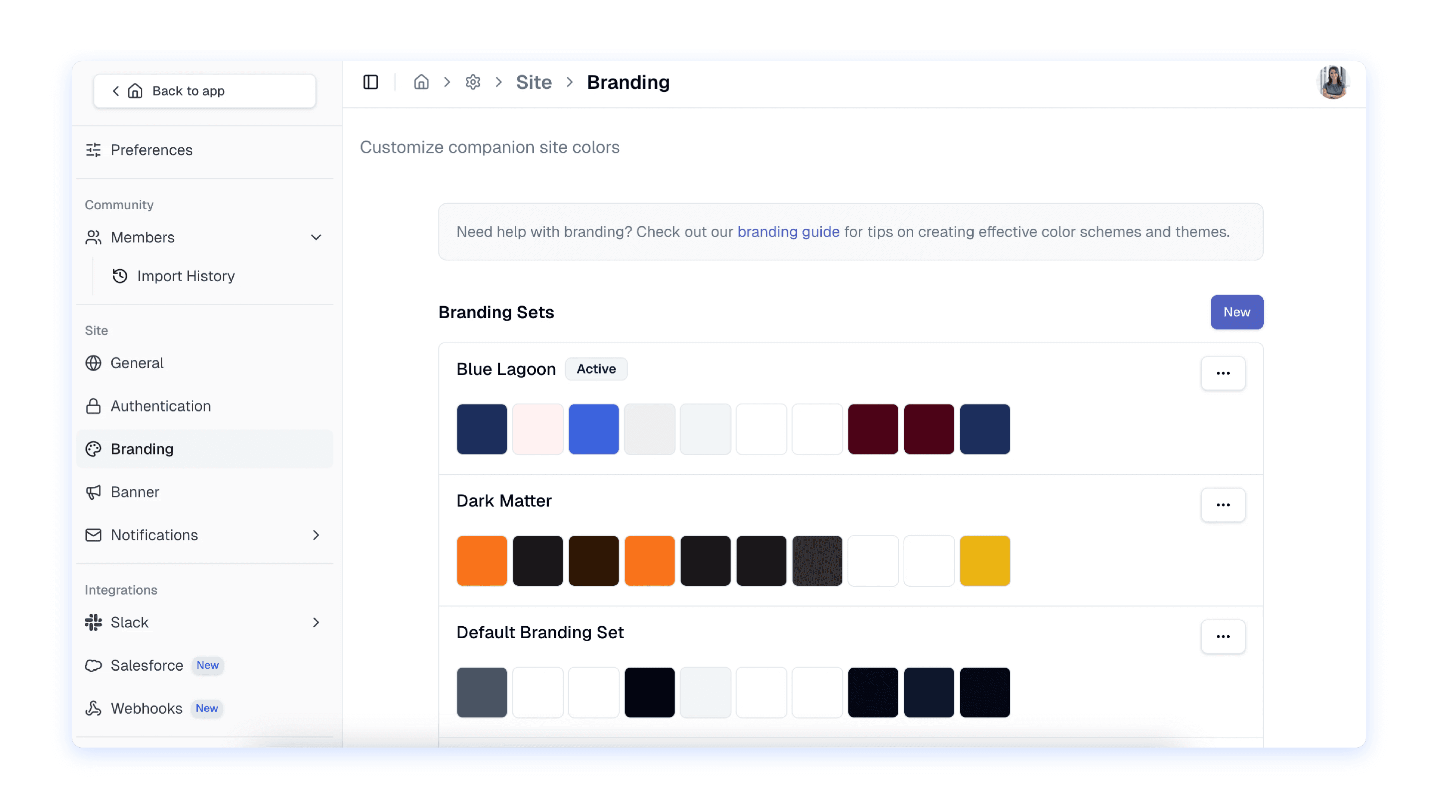 Customize colors, logo, typography, and brand elements across Slack surfaces and the companion site.