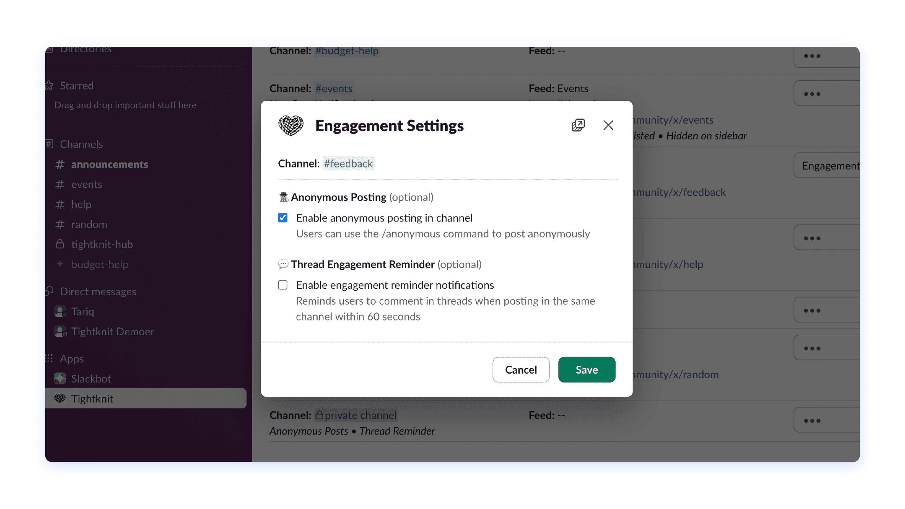 Per-channel engagement controls for prompts, nudges, and posting behaviors.
