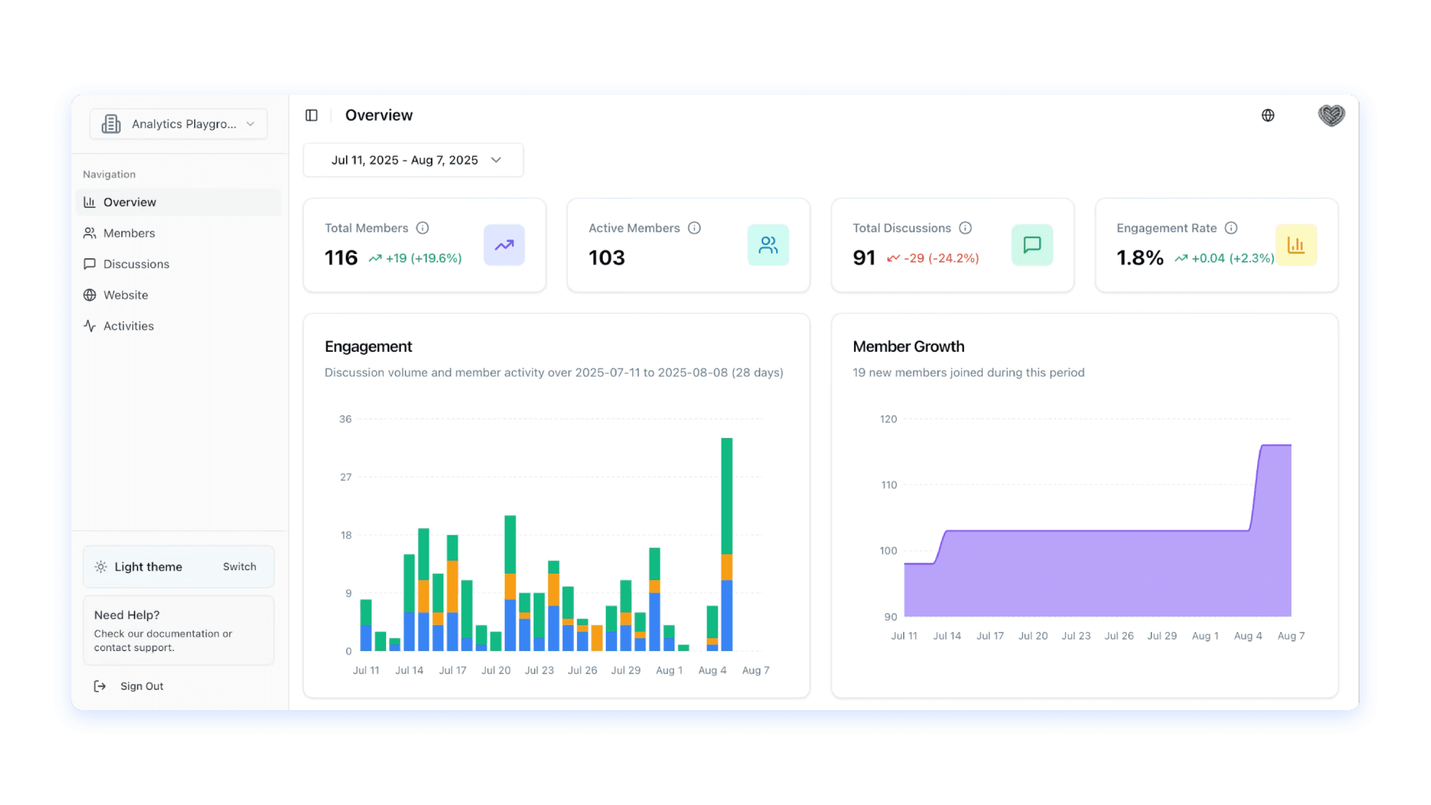 Admin dashboard for community KPIs, configuration, and tenant settings.